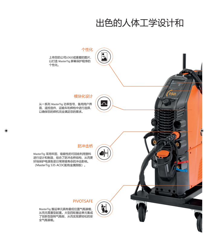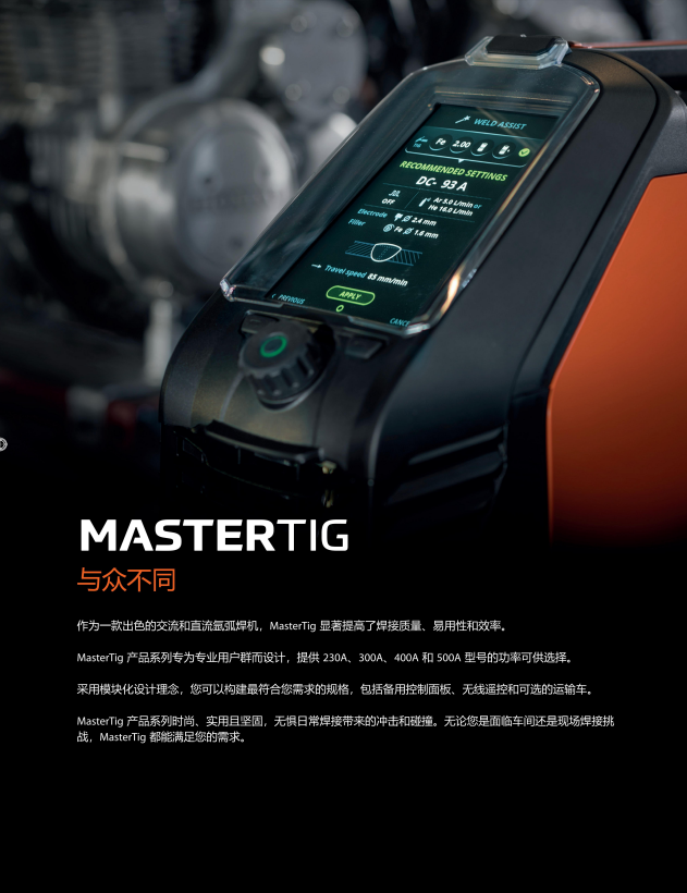 MasterTig 針對交流和直流氬弧焊應(yīng)用中的焊接質(zhì)量、易用性和功率效率設(shè)定了新標(biāo)準(zhǔn)。MasterTig 產(chǎn)品系列專為專業(yè)焊工而設(shè)計(jì),提供高達(dá) 300 A 的可變功率供您選擇。采用模塊化設(shè)計(jì)理念,讓您可以構(gòu)建最符合您需求的規(guī)格,包括備用控制面板、無線遙控和搬運(yùn)單元選件。