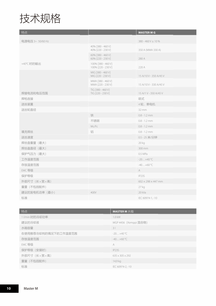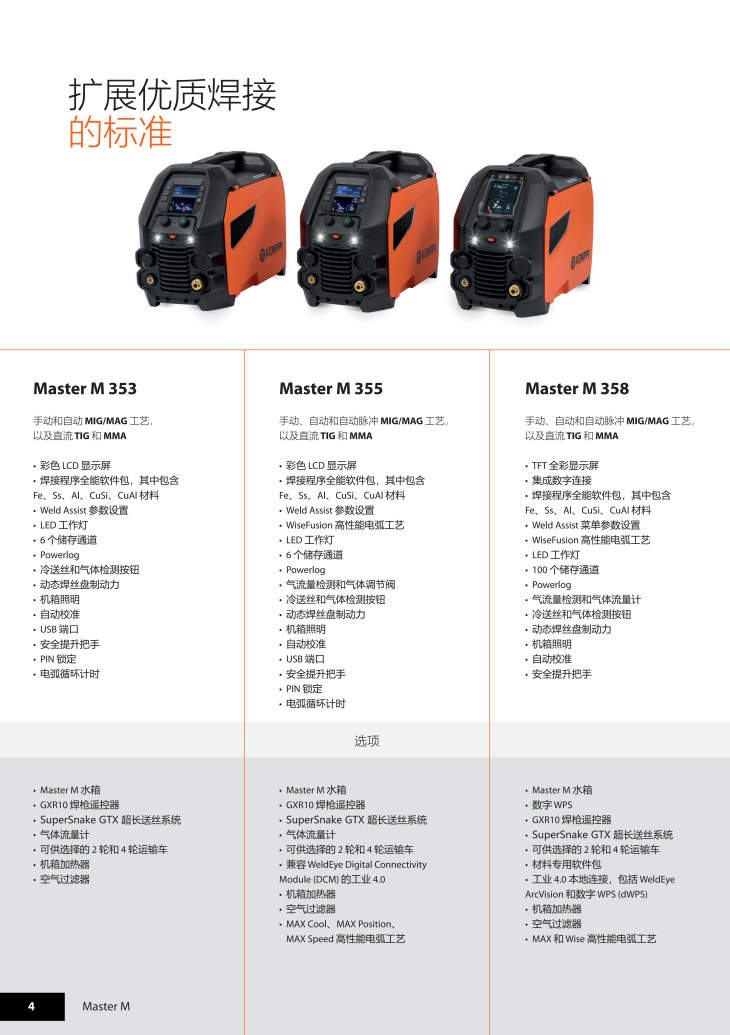 Master M 系列有三個型號,分別為 Master M353 G、355 G和358 G,暫載率為350A@ 40%(220A@100%)。三個型號都具備MIG/MAGTIG和MMA功能,能夠存儲6組焊接通道,提供空冷和水冷配置。